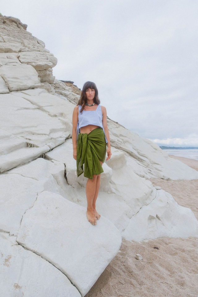 Pièce la plus polyvalente du vestiaire, le pareo est un rectangle long en gaze de lin, conçu pour vous envelopper à la sortie de plage, vous pouvez aussi le nouer autour de la taille pour en faire une mini-jupe.
